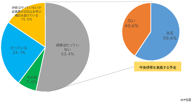 「研修を行っている」「研修は行っていないが従業員がSDGsを学ぶ機会を設けている」と回答した企業は39.6%となった。 一方で、SDGsに関連した従業員研修の実施状況について、「研修を行っていない」と回答した企業が53.4%となった。従業員研修を行っていない企業のうち、研修を行っていない理由には、「具体的な方法が分からない」、「幹部など一部社員で止まっている」などがある。 今後の従業員研修実施の意向について、59.4%の企業が「今後実施する予定がある」と回答している。