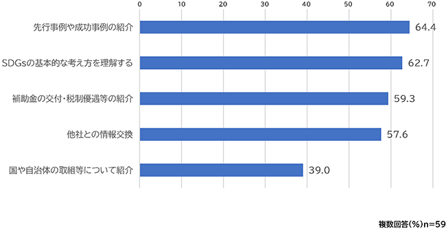 どのような内容の研修があれば参加したいと思うかという問いに関しては、「先行事例や成功事例の紹介(64.4%)」が最も高く、「SDGsの基本的な考え方を理解する(62.7%)」、「補助金の交付・税制優遇等の紹介(59.3%)」、「他社との情報交換(57.6%)」が続いている。