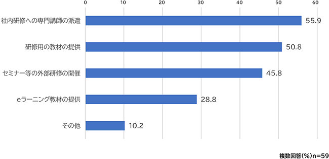 さらに、従業員研修をする際に必要だと思うものに関しては、「社内研修への専門講師の派遣(55.9%)」の割合が最も高く、「研修用の教材の提供(50.8%)」、「セミナー等の外部研修の開催(45.8%)」、「e-ラーニング教材の提供(28.8%)」と続いている。
