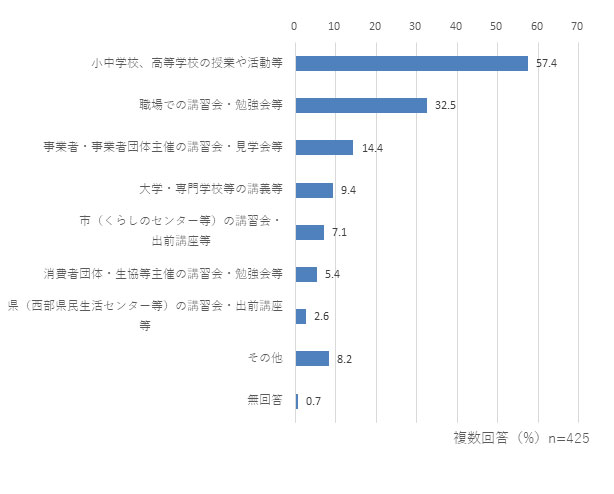消費生活に関する学習経験がある人(425人)の消費者教育の機会は、「小中学校、高等学校の授業や活動等」が57.4%で最も割合が高く、次いで、「職場での講習会・勉強会等」が32.5%で続いている。