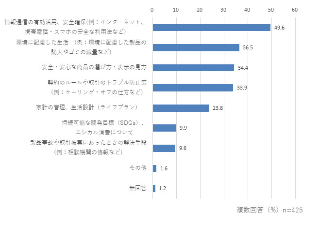 消費生活に関する学習経験がある人(425人)の学習内容は、「情報通信の有効活用、安全確保 (例:インターネット、携帯電話・スマホの安全な利用法など)」(49.6%)が約5割で最も割合が高く、次いで「環境に配慮した生活(例:環境に配慮した製品の購入やゴミの減量など)」(36.5%)、「安全・安心な商品の選び方・表示の見方」(34.4%)、「契約のルールや取引のトラブル防止策 (例:クーリング・オフの仕方など)」(33.9%)が3割台で続いている。