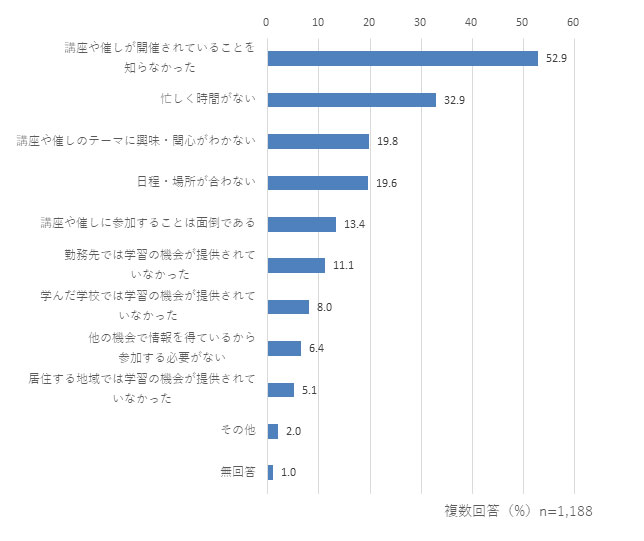 消費生活に関する学習経験がない人(1,188人)の理由は、「講座や催しが開催されていることを知らなかった」(52.9%)が5割を超え最も割合が高く、次いで「忙しく時間がない」(32.9%)が3割強、「講座や催しのテーマに興味・関心がわかない」(19.8%)と「日程・場所が合わない」(19.6%)が約2割で続いている。