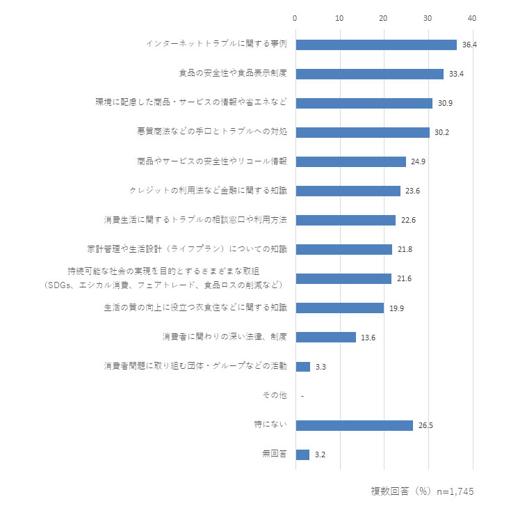 接したことがある消費生活に関する情報は、「インターネットトラブルに関する事例」が36.4%で最も割合が高く、次いで「食品の安全性や食品表示制度」(33.4%)、「環境に配慮した商品・サービスの情報や省エネなど」(30.9%)、「悪質商法などの手口とトラブルへの対処」(30.2%)が3割台前半で続いている。なお、「特にない」は26.5%である。
