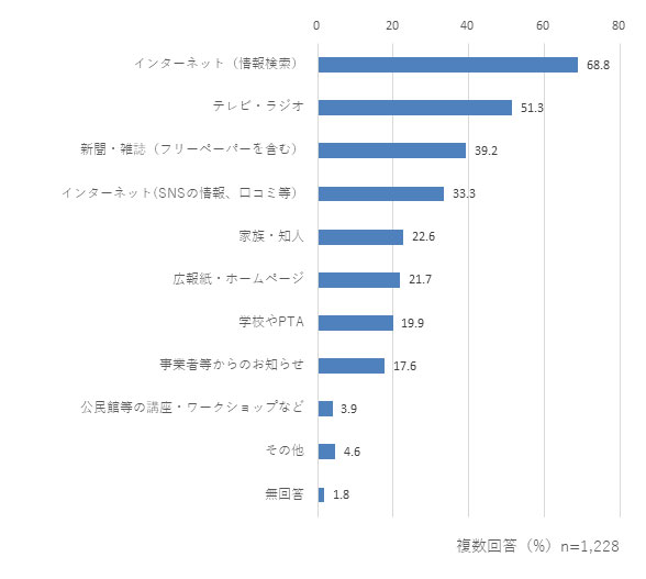 消費生活に関する情報に接したことがある人(1,228人)の主たる情報源は、「インターネット(情報検索)」が68.8%で最も割合が高く、次いで、「テレビ・ラジオ」が51.3%、「新聞・雑誌(フリーペーパーを含む)」が39.2%、「インターネット(SNSの情報、口コミ等)」が33.3%で続いている。