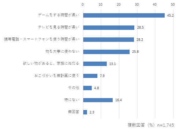 対象のお子さんの普段の生活で問題があると感じている行動は、「ゲームをする時間が長い」が45.2%で最も割合が高く、以下「テレビを見る時間が長い」(28.5%)、「携帯電話・スマートフォンを使う時間が長い」(28.2%)、「物を大事に使わない」(25.8%)が2割台後半で続いている。「特にない」は16.4%で、8割以上の保護者が何らかの問題を感じている。