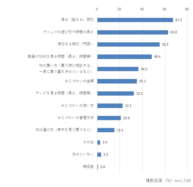家庭での約束事(ルール)は、「寝る(起きる)時刻」が67.3%で最も割合が高いが、「ゲームでの遊び方や時間の長さ」も63.0%で続いている。以下、「帰宅する時刻(門限)」(55.5%)、「動画やSNSを見る時間(長さ、時間帯)」(48.4%)の順である。「決めていない」は3.3%に過ぎず、ほぼすべての家庭で何らかのルールを決めている。