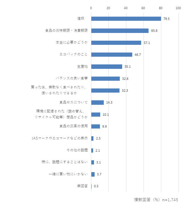 子どもと一緒に買い物するときの話題は、「値段」が79.5%で最も割合が高い。次いで、「食品の賞味期限・消費期限」(65.6%)、「本当に必要かどうか」(57.1%)、「エコバックのこと」(46.7%)の順で続いている。9割以上の家庭が子どもと一緒に買い物するとき消費生活に関する話をしていることがわかる。