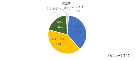 子ども一人での買い物は、「よくある」(1.3%)と「ある」(37.3%)を合わせた「ある(計)」は38.6%、「ない」(20.1%)と「あまりない」(40.5%)を合わせた「ない(計)」は60.6%である。