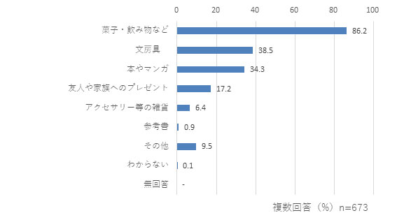 子どもが一人で買い物をすると回答した保護者(673人)の子どもの買い物内容の認識は、全体では、「菓子・飲み物など」が86.2%で圧倒的に割合が高い。以下、「文房具」(38.5%)、「本やマンガ」(34.3%)が3割台で続いている。