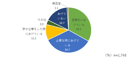 おこづかいの有無は、「定期的にあげている」(33.1%)と「必要な時にあげている」(34.7%)がそれぞれ約3分の1を占め、「家の仕事をした時にあげている」(11.1%)は約1割である。「あげている(計)」は82.2%、一方、「あげていない」は16.7%である。