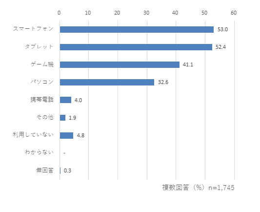 子どもがインターネット利用の際に使う機器は、「スマートフォン」(53.0%)と「タブレット」(52.4%)が5割を超え拮抗している。次いで、「ゲーム機」(41.1%)、「パソコン」(32.6%)の順である。「利用していない」は4.8%で、95%の子どもがインターネットを利用している。