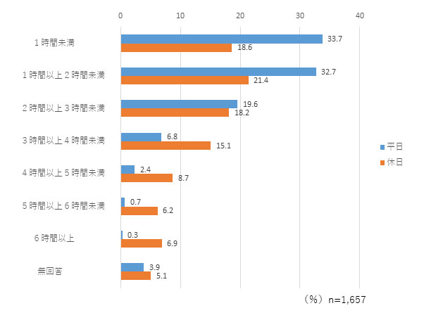 子どもがインターネットを利用すると回答した保護者(1,657人)の子どもの平日平均利用時間の認識は、「1時間未満」が33.7%、「1時間以上2時間未満」が32.7%で、2時間未満の利用が3人に2人を占める。「2時間以上3時間未満」(19.6%)は 約2割、3時間以上の利用が合わせて1割いる。利用時間の平均は76分、中央値は60分である。
