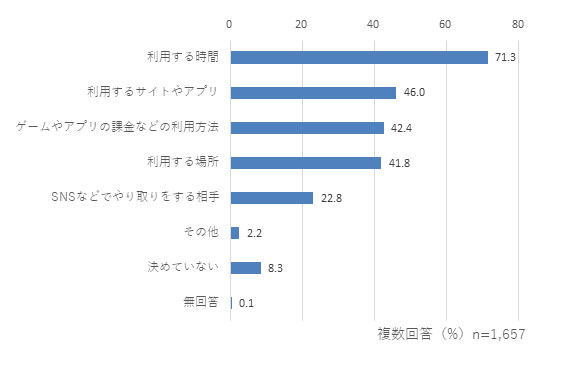 子どもがインターネットを利用すると回答した保護者(1,657人)が決めているインターネット利用の約束事(ルール)は、「利用する時間」が71.3%で最も割合が高い。以下「利用するサイトやアプリ」(46.0%)、「ゲームやアプリの課金などの利用方法」(42.4%)、「利用する場所」(41.8%)が4割台、「SNSなどでやり取りをする相手」(22.8%)が2割台で続いている。
