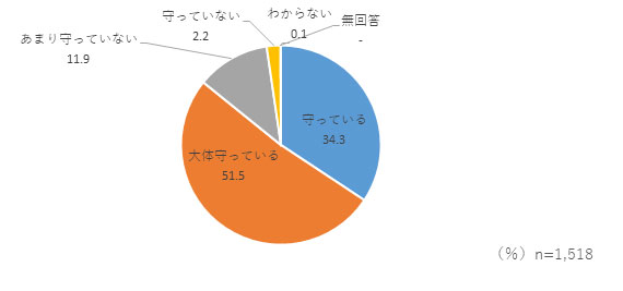 インターネット利用の約束事(ルール)を決めている保護者(1,518人)の子どものルール遵守の認識は、「守っている」が34.3%、「大体守っている」が51.5%で、両方を合わせた「守っている(計)」は85.8%に達している。一方、「守っていない」(2.2%)と「あまり守っていない」(11.9%) を合わせた「守っていない(計)」(14.1%)は1割台である。
