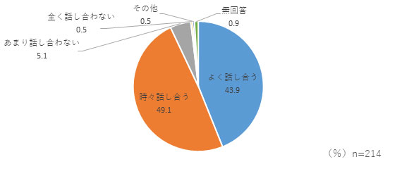 インターネット利用の約束事(ルール)が守られていないと回答した保護者(214人)の子どもとの話し合いは、「よく話し合う」(43.9%)と「時々話し合う」(49.1%)を合わせた「話し合う(計)」は93.0%で、ほとんどの家庭で話し合いをしている。一方、「全く話し合わない」(0.5%)と「あまり話し合わない」(5.1%) を合わせた「話し合わない(計)」(5.6%)は僅かである。