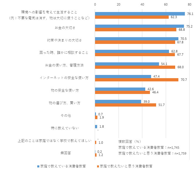 家庭で教えている消費者教育は、「環境への影響を考えて生活すること」(76.1%)と「お金の大切さ」(75.2%)がほぼ同率で4人に3人が回答し、「約束や決まりの大切さ」(70.5%)も7割が挙げている。以下、「困った時、誰かに相談すること」(62.8%)、「お金の使い方、管理方法」(54.1%)と続いている。