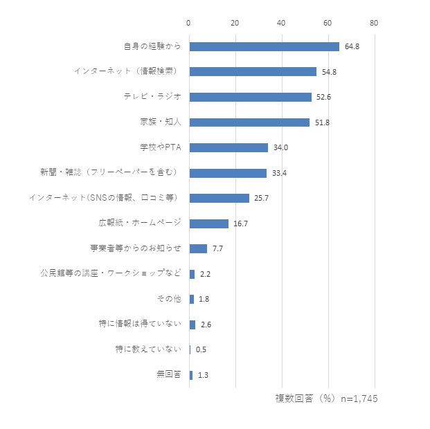 家庭での消費者教育の際に必要な情報源は、「自身の経験から」が64.8%で最も割合が高く、次いで、5割台前半で「インターネット(情報検索)」(54.8%)、「テレビ・ラジオ」(52.6%)、「家族・知人」(51.8%)が僅差で続いている。