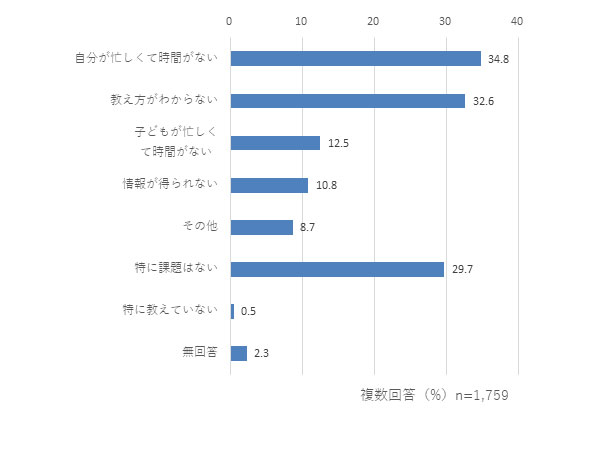 家庭で教える際の課題は、「自分が忙しくて時間がない」が34.8%で最も割合が高いが、「教え方がわからない」も32.6%と僅差で続いている。なお、「特に課題はない」(29.7%)は約3割で、7割弱の保護者が課題を感じている。