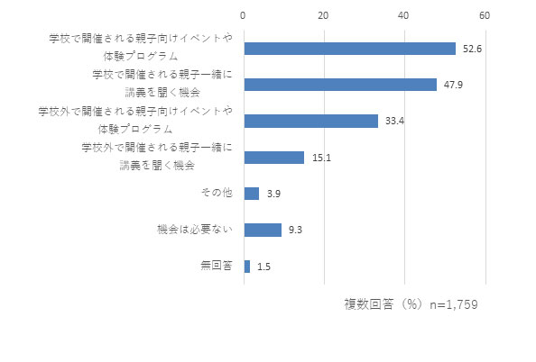 親子が一緒に学ぶための機会は、「学校で開催される親子向けイベントや体験プログラム」が52.6%で最も割合が高く、次いで「学校で開催される親子一緒に講義を聞く機会」が47.9%、「学校外で開催される親子向けイベントや体験プログラム」が33.4%、「学校外で開催される親子一緒に講義を聞く機会」が15.1%となっている。開催場所は「学校外」より「学校」の支持が多く、学習手法は「講義」より「イベント・体験プログラム」の支持が多い。