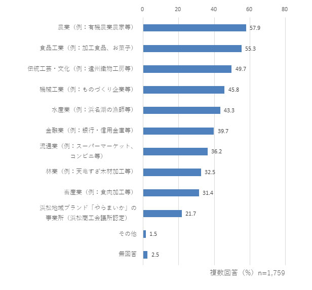 親子で訪ねてみたい体験プログラムは、「農業(例:有機農業農家 等)」が57.9%で最も割合が高いが、「食品工業(例:加工食品、お菓子)」(55.3%)も僅差で続いている。以下、「伝統工芸・文化(例:遠州織物工房 等)」(49.7%)、「機械工業(例:ものづくり企業 等)」(45.8%)、「水産業(例:浜名湖の漁師 等)」(43.3%)の順となっている。