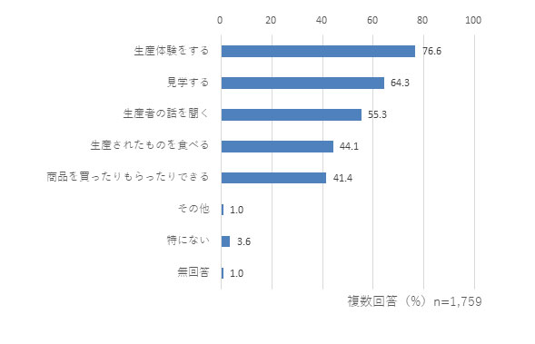 親子で参加する体験プログラムの内容は、「生産体験をする」が76.6%で最も割合が高く、次いで「見学する」(64.3%)、「生産者の話を聞く」(55.3%)の順となっている。